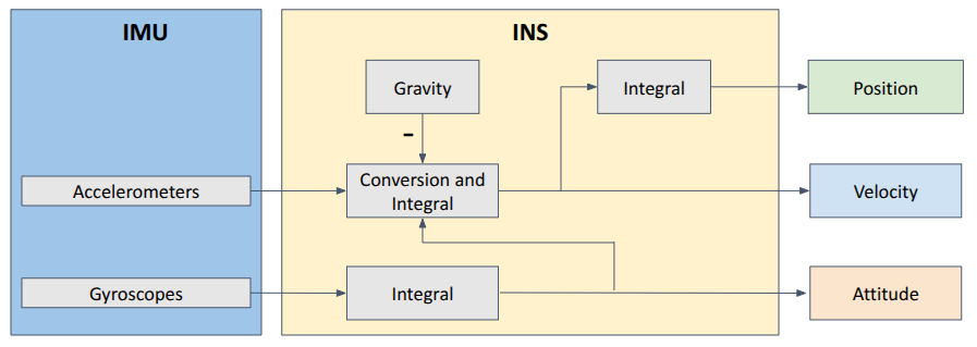 The INS is highly efficient for short term navigation. As the sensors are integrated over time, there is a residual error that tends to increase. Therefore, corrections must be regularly applied on the INS outputs to keep reasonable errors.