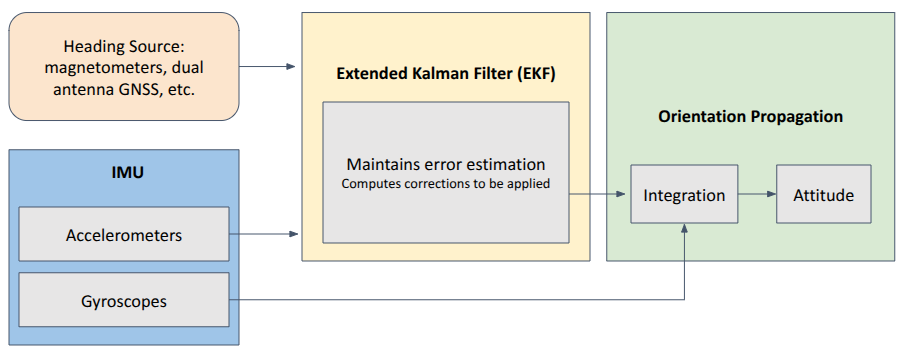 An Attitude and Heading Reference System (AHRS) is a sensor assembly that pairs an IMU with an additional sensor—commonly a magnetometer—to determine heading. It uses gravity as a vertical reference to stabilize the IMU, merging data from the gyroscopes with the accelerometer’s gravity readings in a Kalman filter to calculate roll and pitch. For heading, an auxiliary sensor such as a magnetometer or a dual-antenna GNSS is used. While an AHRS can provide precise roll, pitch, and yaw data under low to moderate dynamic conditions and is straightforward to set up and operate, its overall accuracy might be compromised in highly dynamic environments or areas with significant magnetic disturbances.